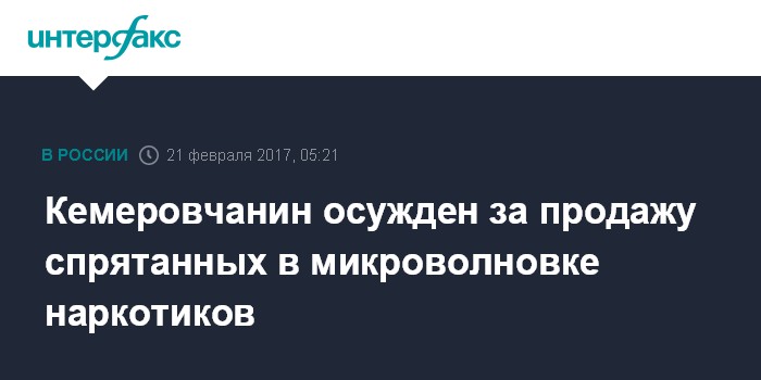 Москва. 21 февраля. INTERFAX.RU - Суд Центрального района города Кемерово приговорил местного жителя к пяти годам колонии за незаконную покупку наркотиков, спрятанных в микроволновой печи, для их последующего сбыта, сообщает во вторник пресс-служба Управления ФСБ по Кемеровской области.
