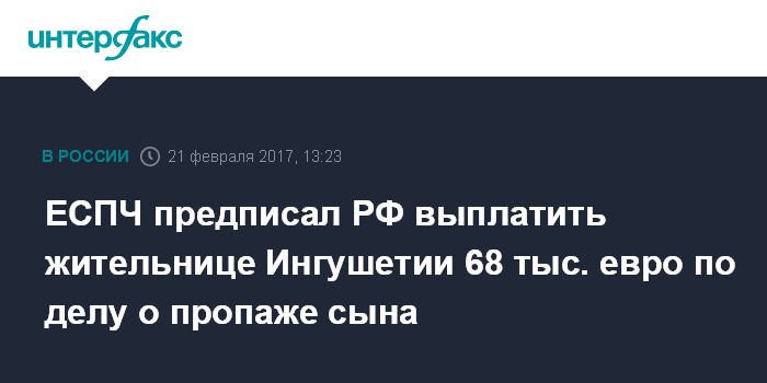 Москва. 21 февраля. INTERFAX.RU - Страсбургский суд обязал правительство России выплатить 68 тысяч евро жительнице Ингушетии по делу об исчезновении ее родственника в 2006 году.