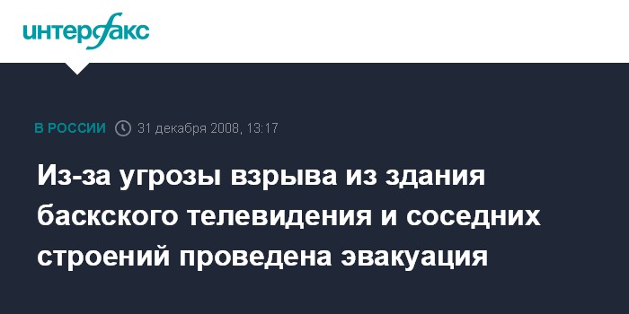 Москва. 31 декабря. INTERFAX.RU - В штаб-квартире баскского телевидения в городе Бильбао в среду проведена эвакуация после того, как неизвестный позвонил в редакцию и от имени баскской сепаратистской организации ЭТА сообщил о том, что неподалеку от здания находится фургон со взрывчаткой.