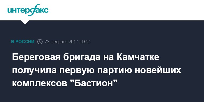 Москва. 22 февраля. INTERFAX.RU - Минобороны России развернуло на Камчатке первую батарею новейших сверхзвуковых береговых ракетных комплексов (БРК) "Бастион", пишет в среду газета "Известия".