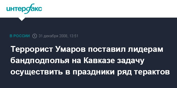 Руководитель оперативного штаба - замминистра внутренних дел России генерал-полковник Аркадий Еделев сообщил, что "террористом Доку Умаровым перед лидерами бандподполья Северо-Кавказского региона поставлена задача на осуществление ряда диверсионно-террористических актов по всей территории Южного федерального округа в преддверии и в период проведения новогодних праздников". Он отметил, что "серьезность намерений экстремистов подтверждается выявленными фактами проведения бандитами подготовительных мероприятий к осуществлению терактов".