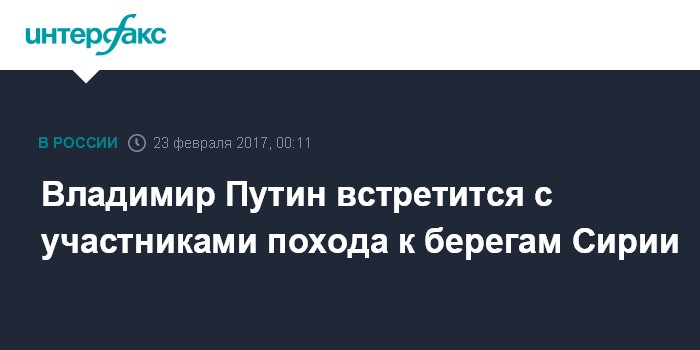 Москва. 23 февраля. INTERFAX.RU - Президент РФ Владимир Путин в четверг, в День защитника Отечества, встретится с участниками военного морского похода к берегам Сирии.
