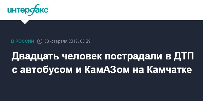 Москва. 23 февраля. INTERFAX.RU - В аварии с участием пассажирского автобуса и грузовика в Мильковском районе Камчатского края пострадали 20 человек, сообщает в четверг пресс-служба правительства региона.