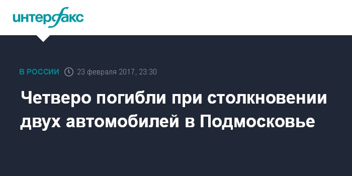 Москва. 23 февраля. INTERFAX.RU - В результате столкновения двух автомобилей в Подмосковье четыре человека погибли и трое пострадали, сообщили "Интерфаксу" в областном главке полиции.