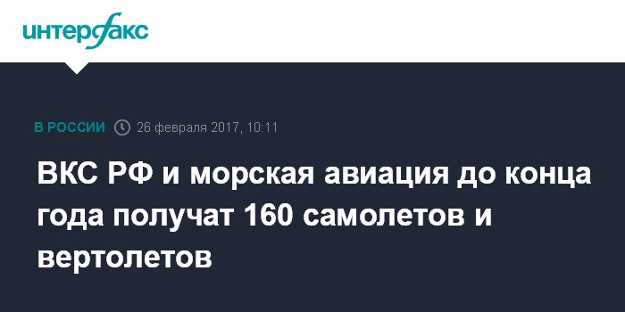 Москва. 26 февраля. INTERFAX.RU - Около 160 самолетов и вертолетов получат в этом году Воздушно-космические силы РФ и морская авиация ВМФ России, сообщил главком ВКС, герой России генерал-полковник Виктор Бондарев.
