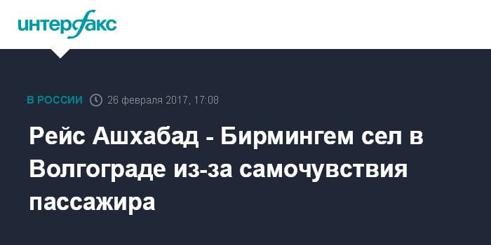 Москва. 26 февраля. INTERFAX.RU - Пассажирский авиалайнер, направлявшийся из Ашхабада в Бирмингем экстренно сел в Волгограде, сообщил в воскресенье "Интерфаксу" источник в экстренных службах.