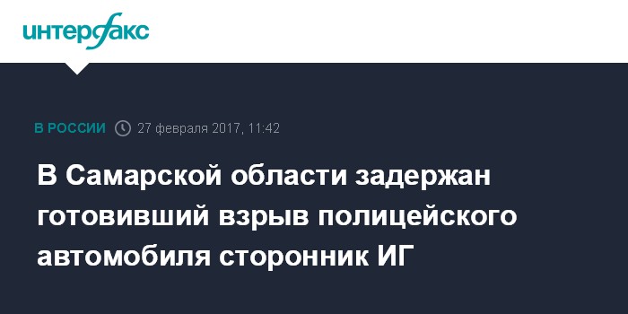 Москва. 27 февраля. INTERFAX.RU - Сотрудники ФСБ России задержали в Самарской области завербованного ИГ ( "Исламское государство", организация запрещена в РФ) местного жителя, который с помощью самодельной взрывчатки готовился взорвать автомобиль с полицейскими и завладеть их оружием. Об этом сообщил агентству "Интерфакс" источник в правоохранительных органах региона в понедельник.