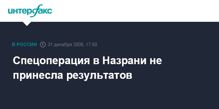 Москва. 31 декабря. INTERFAX.RU - Спецоперация, проводившаяся правоохранительными органами в среду днем в Назрани, завершена. Как сообщил агентству "Интерфакс" источник в МВД Ингушетии, "спецоперация полностью завершена и, по предварительной информации, не дала никаких результатов".