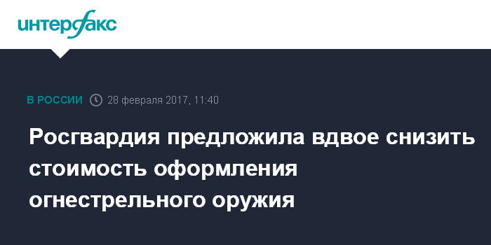 Москва. 28 февраля. INTERFAX.RU - Подготовленный Росгвардией законопроект позволит снизить стоимость оформления огнестрельного оружия для гражданских лиц до 400 рублей, сказал руководитель договорно-правового департамента Федеральной службы войск национальной гвардии РФ Александр Школьников.