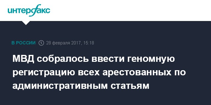 Москва. 28 февраля. INTERFAX.RU - МВД РФ намерено расширить круг лиц, подлежащих обязательной геномный регистрации, и включить в него не только лиц, совершивших уголовные преступления, но и тех, кто подвергся административному аресту.