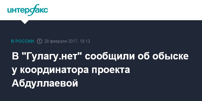 Москва. 28 февраля. INTERFAX.RU - У координатора проекта "Гулагу.нет" (Gulagu.net) Елены Абдуллаевой проводится обыск, сообщил основатель портала Владимир Осечкин на своей странице в фейсбуке.