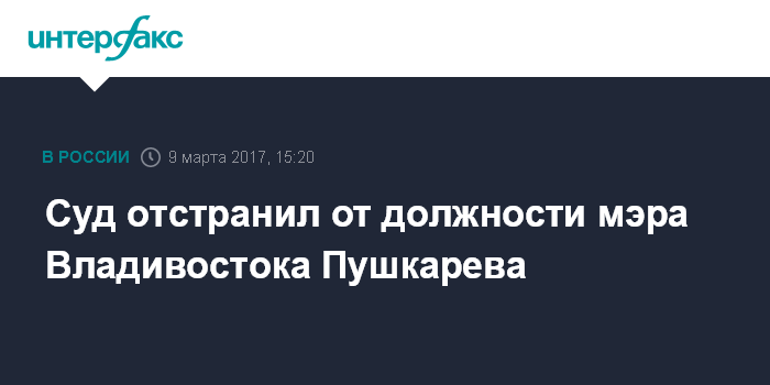 Москва. 9 марта. INTERFAX.RU - Басманный суд Москвы отстранил от занимаемой должности мэра Владивостока Игоря Пушкарева, обвиняемого в злоупотреблении полномочиями и коммерческим подкупом, сообщила "Интерфаксу" пресс-секретарь суда Юнона Царева.