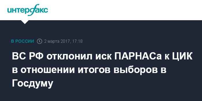 Москва. 2 марта. INTERFAX.RU - Верховный суд РФ отклонил иск "Партии народной свободы" (ПАРНАС) к Центральной избирательной комиссии об отмене результатов выборов в Госдуму, состоявшихся 18 сентября 2016 года.