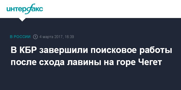 Москва. 4 марта. INTERFAX.RU - Поисково-спасательные работы на месте схода лавины на северном склоне горы Чегет в Кабардино-Балкарии полностью завершены, сообщается на сайте главного управления МЧС России по республике в субботу.