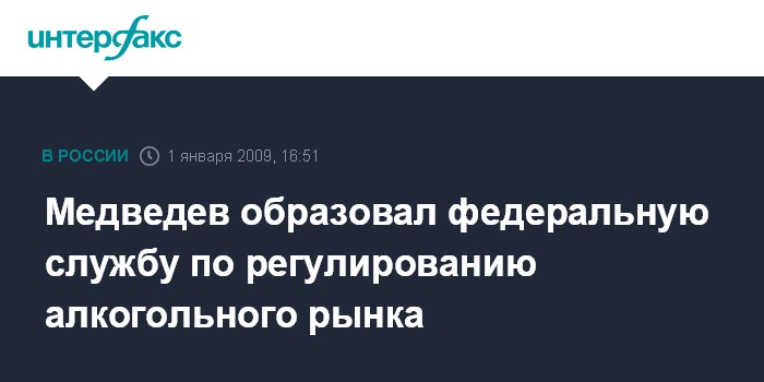 Москва. 1 января. INTERFAX.RU - Президент России Дмитрий Медведев подписал указ "Об образовании Федеральной службы по регулированию алкогольного рынка", сообщает в четверг пресс-служба Кремля.