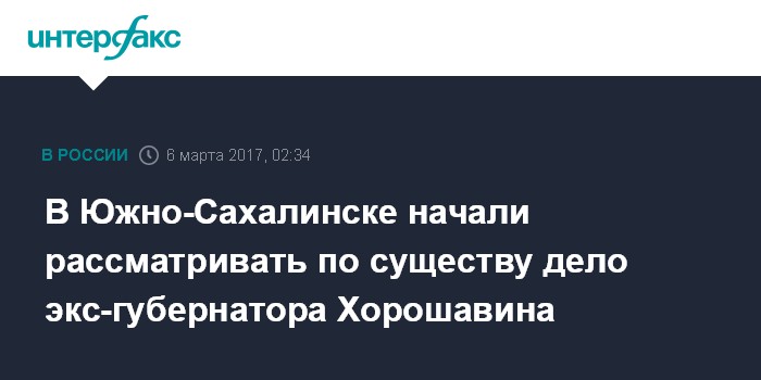 Москва. 6 марта. INTERFAX.RU - Южно-Сахалинский городской суд в понедельник приступает к рассмотрению по существу уголовного дела сахалинского экс-губернатора Александра Хорошавина и нескольких его подчиненных, обвиняемых в получении взятки в особо крупном размере.