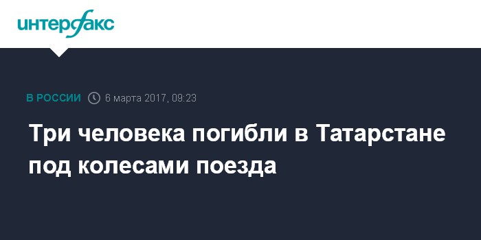 Москва. 6 марта. INTERFAX.RU - Три человека в понедельник утром были насмерть сбиты поездом в Арском районе Татарстана. "По предварительным данным, при переходе железнодорожных путей погибли мужчина и двое женщин", - сообщили агентству "Интерфакс" в пресс-службе МВД по Татарстану. Собеседник агентства уточнил, что людей сбил поезд пригородного сообщения.