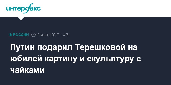 Москва. 6 марта. INTERFAX.RU - Президент России Владимир Путин поздравил первую женщину-космонавта Валентину Терешкову с 80-летием и подарил ей скульптуру "Чайка садится на Волгу" и картину "Чайки над Волгой" ("Чайка" - позывной Терешковой во время ее полета в космос - ИФ).