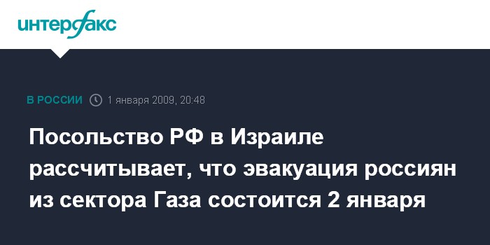 Тель-Авив. 1 января. ИНТЕРФАКС - В посольстве России в Тель-Авиве рассчитывают, что 2 января российских граждан удастся эвакуировать из сектора Газа.