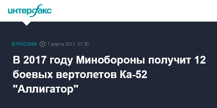 Москва. 7 марта. INTERFAX.RU - Арсеньевский вертолетный завод "Прогресс" в рамках выполнения государственного оборонного заказа на 2017 год поставит военному ведомству 12 боевых вертолетов Ка-52 "Аллигатор", сообщил во вторник журналистам заместитель министра обороны РФ Юрий Борисов при посещении предприятия.