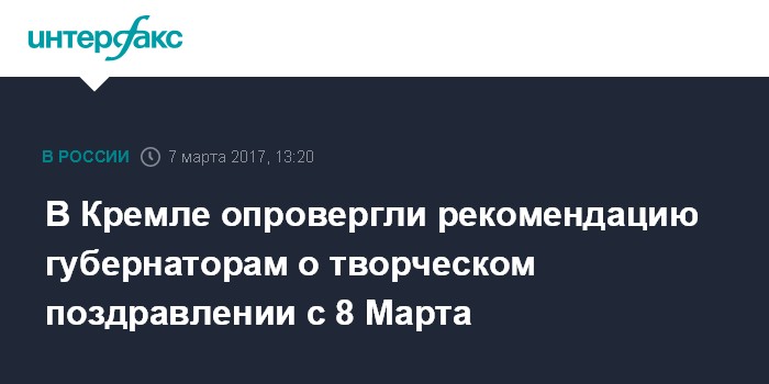 Во вторник в СМИ появилась информация, что администрация президента рекомендовала губернаторам творчески подойти к поздравлениям женщин с 8 Марта. По словам источника газеты "Коммерсантъ" в одном из региональных правительств, АП попросила губернаторов выпустить на местных телеканалах поздравления в стихотворной форме.