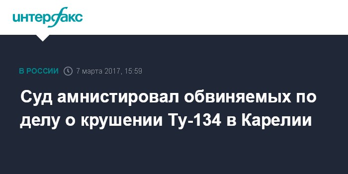 Москва. 7 марта. INTERFAX.RU - Прионежский районный суд признал виновными фигурантов дела о крушении Ту-134 в Карелии в 2011 году, но амнистировал всех троих подсудимых, передал корреспондент "Интерфакса" во вторник из зала суда.