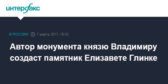 Москва. 7 марта. INTERFAX.RU - Автор монумента князю Владимиру Салават Щербаков работает над созданием памятника Елизавете Глинке, сообщает подмосковное "Радио 1".