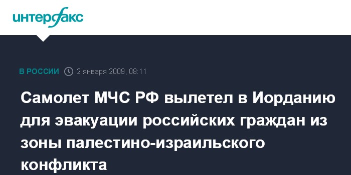 Москва. 2 января. ИНТЕРФАКС - Из России в Аман (Иордания) около 8:00 мск пятницы вылетел самолет "Ил-62" МЧС РФ для эвакуации российских граждан из зоны палестино-израильского конфликта, передал корреспондент "Интерфакса".