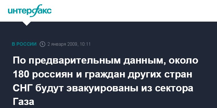 Москва/Тель-Авив. 2 января. INTERFAX.RU - Около 180 граждан России и некоторых стран СНГ, по всей вероятности, будут эвакуированы в пятницу из сектора Газа через Иорданию самолетами МЧС России.
