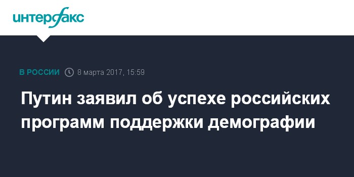 Москва. 8 марта. INTERFAX.RU - Президент РФ Владимир Путин отметил "колоссальный эффект" от реализации в стране программы строительства перинатальных центров, заявил, что в России успешно преодолевается демографическая проблема.