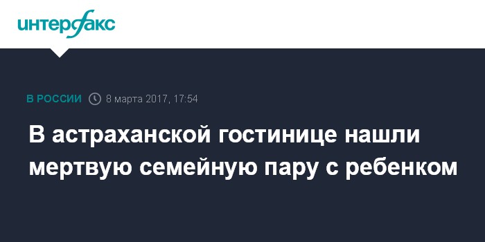 Москва. 8 марта. INTERFAX.RU - Семейная пара с ребенком, предположительно, отравились насмерть угарным газом в гостинице, расположенной в Ленинском районе Астрахани, сообщили в среду "Интерфаксу" в следственном управлении СКР по региону.