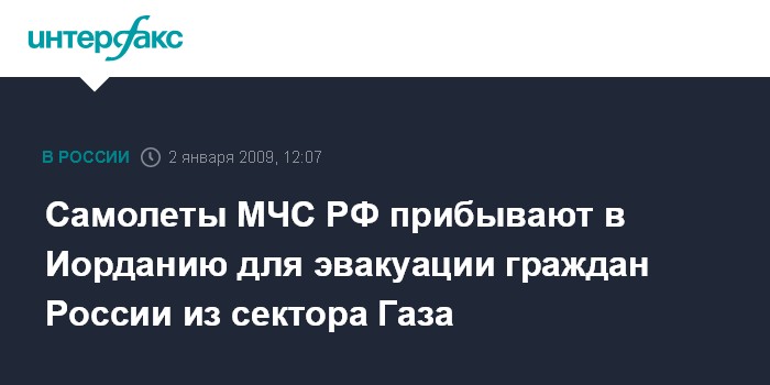 Москва. 2 января. INTERFAX.RU - Самолеты МЧС России, направляемые в Иорданию для эвакуации из зоны израильско-палестинского конфликта граждан России и стран СНГ, прибывают в аэропорт Амман.