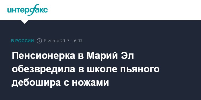 Москва. 9 марта. INTERFAX.RU - Бабушка ученика одной из марийских школ сумела утихомирить пьяного дебошира с ножами, напавшего на заместителя директора учебного заведения, сообщает республиканское следственное управление СКР в четверг.