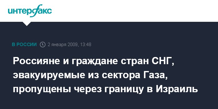 Тель-Авив. 2 января. INTERFAX.RU - Переход граждан России и некоторых стран СНГ, эвакуируемых из сектора Газа через КПП на границе с Израилем, практически завершен, сообщила пресс-атташе посольства РФ в Тель-Авиве Анастасия Федорова, которая находится на месте событий.