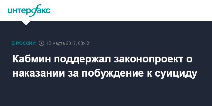 Москва. 10 марта. INTERFAX.RU - Правительство поддержало законопроект о повышении уголовной ответственности за побуждение несовершеннолетних к самоубийству с учетом замечаний терминологического и юридико-технического характера, говорится в сообщении на сайте кабинета министров. Законопроект был накануне внесен в Госдуму депутатом Ириной Яровой.