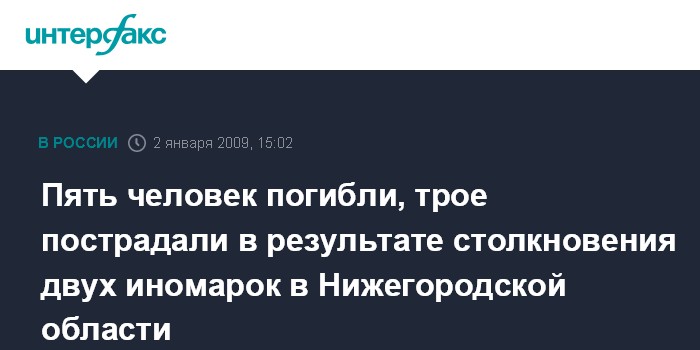 Нижний Новгород. 2 января. INTERFAX.RU - В Нижегородской области, на трассе М7 в пятницу в результате ДТП пять человек погибли, три человека пострадали.
