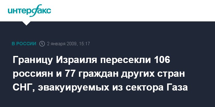 Тель-Авив. 2 января. INTERFAX.RU - 183 гражданина России и некоторых стран СНГ, эвакуируемых из сектора Газа, прошли паспортный контроль на КПП у границы с Израилем и в ближайшее время отправятся в Иорданию, сообщила пресс-атташе российского посольства в Телль-Авиве Анастасия Федорова.