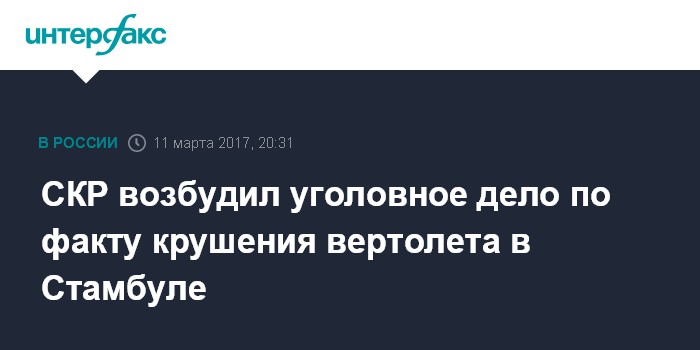 Москва. 11 марта. INTERFAX.RU - Следственный комитет России возбудил уголовное дело по факту крушения вертолета в Стамбуле 10 марта, на котором находились жители Санкт-Петербурга, сообщила в субботу пресс-служба СКР.