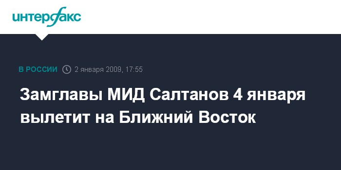 "Спецпредставитель президента РФ по Ближнему Востоку, заместитель министра иностранных дел А.Салтанов 4 января вылетает в регион", - говорится в сообщении департамента информации и печати МИД РФ, размещенном в пятницу на сайте ведомства.