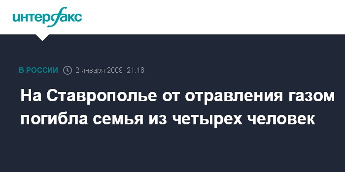 "Вечером в пятницу в одном из домовладений в селе Грушевское Александровского района Ставропольского края были обнаружены тела четырех человек: мужчины, женщины, а также двух малолетних детей. По предварительным данным, их смерть наступила от отравления бытовым газом", - сообщили агентству "Интерфакс-Юг" в пресс-службе регионального центра МЧС РФ.