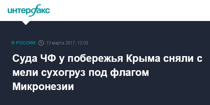 "В Крыму завершилась спасательная операция по съёмке с мели сухогруза под флагом Микронезии. Судно "Ривер Эрегли" следовало из болгарского порта Бургас в порт Новороссийск. Экипаж состоит из семи человек - граждан Украины. В субботу при нахождении сухогруза на траверзе южной оконечности Крымского полуострова у него отказали главные двигатели, судно обесточилось, потеряло ход и начало дрейф в сторону береговых отмелей", - сообщил Трухачёв.