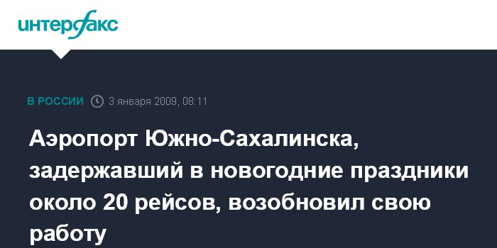 Южно-Сахалинск. 3 января. ИНТЕРФАКС-ДАЛЬНИЙ ВОСТОК - Аэропорт Южно-Сахалинска возобновил свою работу после трех дней простоя из-за циклона, который в новогоднюю ночь накрыл юг Сахалина.