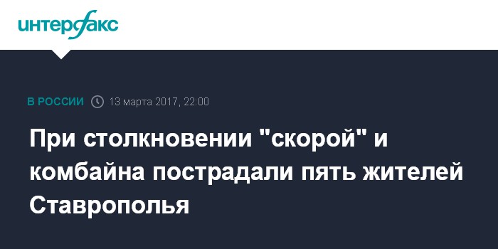 Москва. 13 марта. INTERFAX.RU - Карета "скорой помощи" и комбайн столкнулись в Буденновском районе Ставрополья, ранены пять человек, сообщил "Интерфаксу" представитель УГИБДД региона Евгений Синицын.