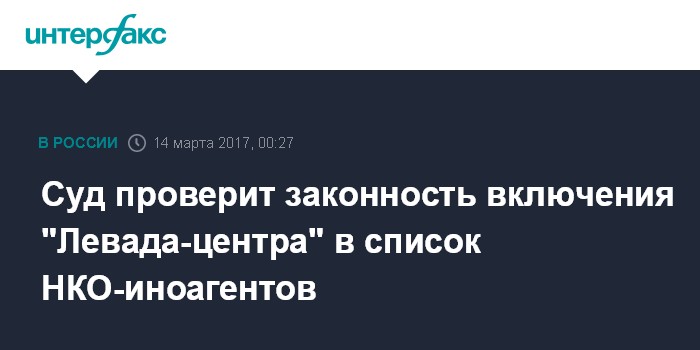 Москва. 14 марта. INTERFAX.RU - Мосгорсуд во вторник проверит законность включения негосударственной исследовательской организации "Левада-центр" в реестр некоммерческих организаций (НКО)-"иностранных агентов", сообщила "Интерфаксу" пресс-секретарь Замоскворецкого суда Москвы Эмилия Хиль. Апелляционная инстанция рассмотрит жалобу "Левада-центра" на постановление Замоскворецкого суда Москвы, который 18 ноября прошлого года отклонил административный иск НКО к министерству юстиции России.