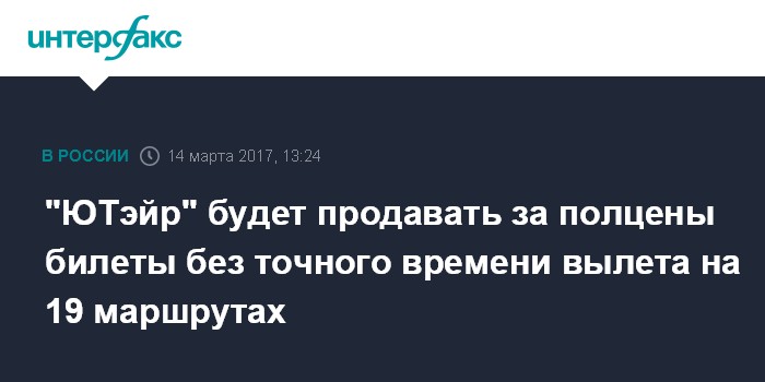 Москва. 14 марта. INTERFAX.RU - Авиакомпания "ЮТэйр" распространит тарифную опцию "Открытый" - когда билеты без точного времени вылета можно приобрести за полцены - на 19 маршрутов.