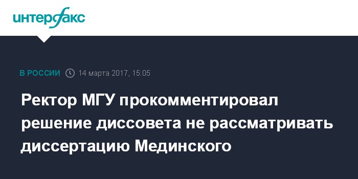 "Ъ" узнал о нарушениях при вынесении в МГУ решения по диссертации МединскогоЧитать подробнее"Решение совета: ознакомившись с материалами, диссертационный совет исторического факультета не видит оснований для дальнейшего рассмотрения ввиду отсутствия указаний на заимствования и нарушение процедуры защиты", - сказал Садовничий на пресс-конференции в Москве во вторник.