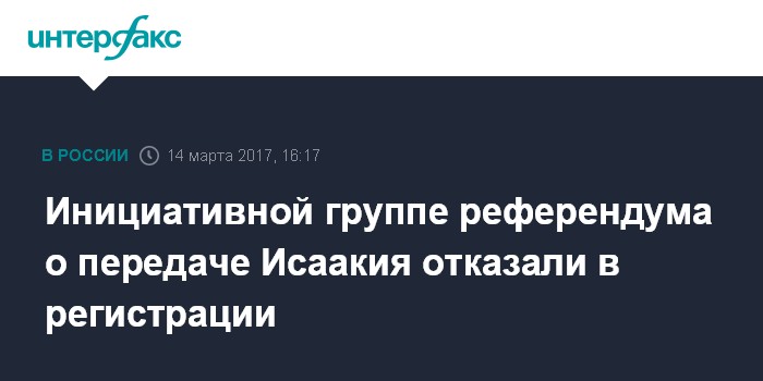 Москва. 14 марта. INTERFAX.RU - Городская избирательная комиссия Санкт-Петербурга единогласно отказала в регистрации инициативной группы референдума о передаче Исаакиевского собора Русской православной церкви.