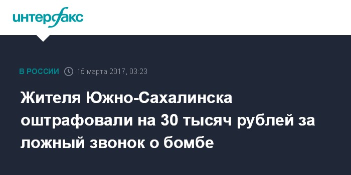 Москва. 15 марта. INTERFAX.RU - Житель Южно-Сахалинска оштрафован на 30 тыс. рублей за ложное сообщение о том, что он собирается взорвать многоквартирный дом в пригороде областного центра.