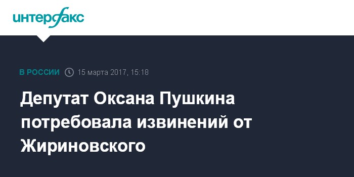 Москва. 15 марта. INTERFAX.RU - Депутат Госдумы и телеведущая Оксана Пушкина заявила, что уже не первый раз конфликтует с лидером ЛДПР Владимиром Жириновским из-за его высказываний по Рузскому району Московской области, от которого она избрана представителем в Госдуму. По ее мнению, он должен извиниться за свои выпады в адрес коллег.