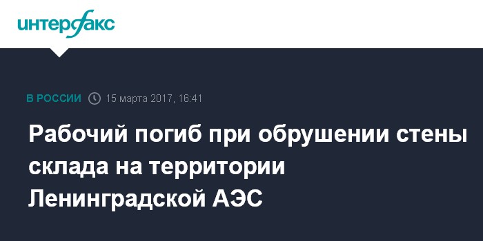 Москва. 15 марта. INTERFAX.RU - На территории Ленинградской атомной электростанции (ЛАЭС, Ленинградская область) произошло обрушение стены временного склада, один рабочий погиб, сообщили "Интерфаксу" в пресс-службе станции в среду.